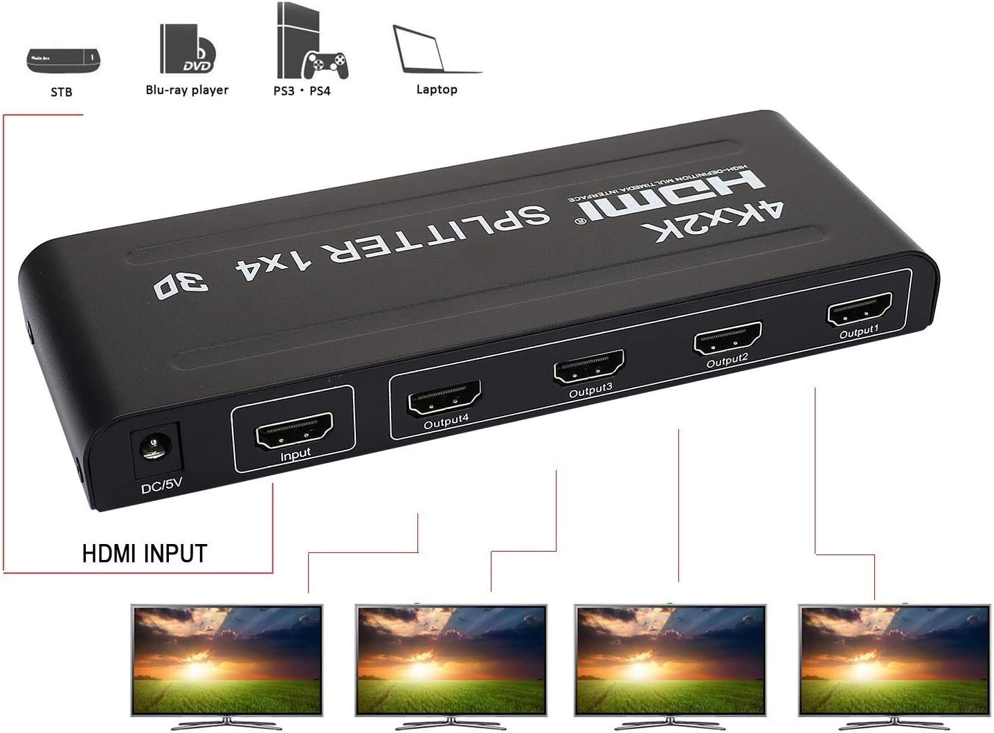 1x4 HDMI Splitter, 1 in 4 Out HDMI Splitter Audio Video Distributor Box Support 3D & 4K x 2K
