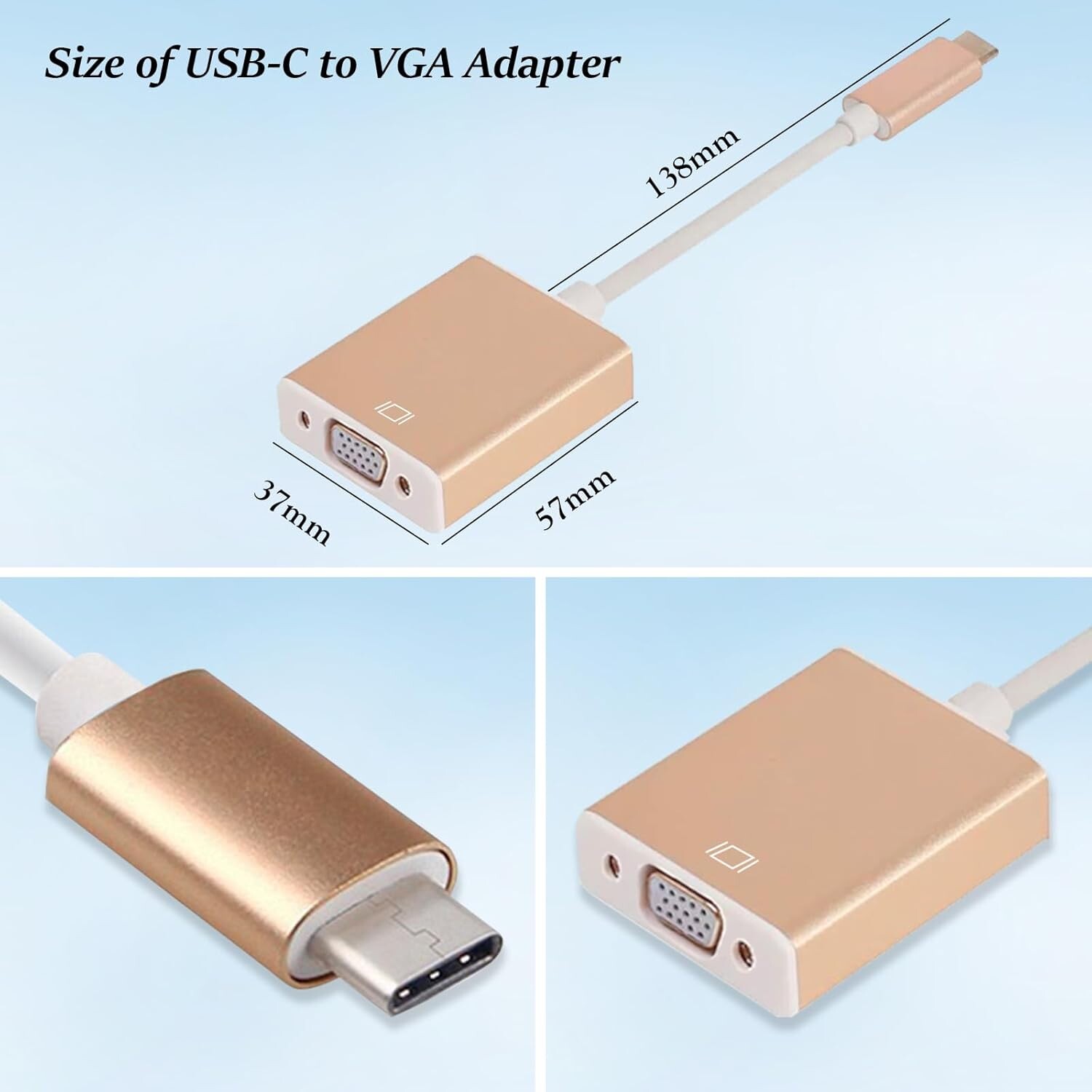 The compact-designed portable USB-C to VGA adapter connects a computer, desktop, laptop, or other devices with USB-C port to a monitor, projector, HDTV, or other devices with VGA port; Tuck this lightweight gadget into your bag or pocket to do a business p
