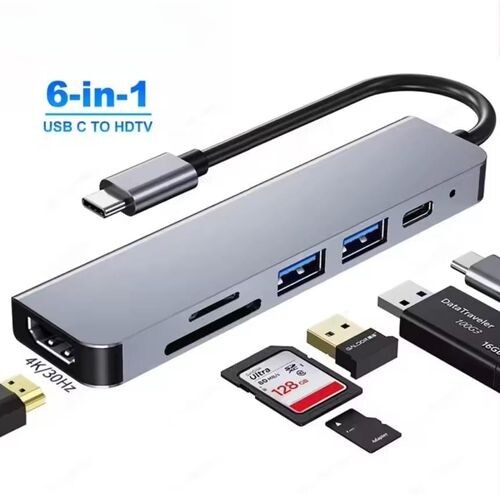 Upgrade your connectivity with this powerful 6-in-1 USB Type-C Hub – the perfect companion for your laptop, tablet, or smartphone. Designed for versatility and speed, this compact hub transforms a single USB-C port into six essential ports, helping you stay productive whether you're at home, in the office, or on the go. Crafted with a sleek aluminum body, this hub is not only stylish but also durable and heat-resistant.